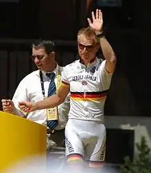 Fabian Wegmann (pictured at the 2007 Tour de France) is one of seven cyclists to have won three championships (in 2007, 2008, and 2012).