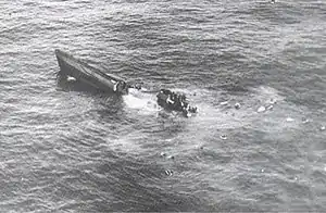 The U-boat, now under the command of Oberleutnant zur See Siegfried Straub, left Brest on 29 February 1944 on her tenth and final patrol.[17] On 10 March, west of Ireland, in position 52°35′N 20°19′W / 52.583°N 20.317°W / 52.583; -20.317, she was sunk by depth charges from a Canadian Sunderland patrol bomber EK591 "2U" from No. 422 Squadron RCAF. All 53 hands were lost.[1] "The crew of the Canadian amphibious plane, the Sunderland, reported that it had sunk a German U-boat off the west coast of Ireland and that the crew were swimming around in the water. Pictures of the attack & sinking of U-625, and of some of the crew that escaped in liferafts (not all), were taken by the cameras aboard the Sunderland. The plane circled a few times and headed back to its home base. None of the submarine crew survived; before having a chance to be rescued, they were lost in high seas. Those pictures hung in the office of Sir Winston Churchill for a period during the war; it was the only confirmed proof of a U-boat "kill" by a Canadian coastal squadron during World War II. U-625 was one of 543 German ships that went lost together with its entire crew" (Neitzel & Welzer 2012:261, with two photos on p. 262 of U-625 being attacked and about half of the crew clustered together in the water in one-man rafts.)