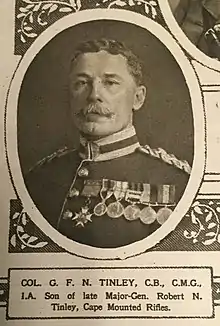 In 1891 Tinley married firstly Elsie Benton, a daughter of William Benton Hughes, of the U.S. Army (Quartermaster Staff) (West Point Officers in the Civil War, Class of 1856). She died in 1907.[6] Their son Francis Benton Newport Tinley M.C., (despatches), (wounded), who joined the 20th Deccan Horse in 1911, was promoted to captain on 6 September 1915.[7] He went on to rise to the rank of lieutenant-colonel and married Cicely Sophia and was killed in action in 1942. On July 10, 1912, he married secondly Beryl Randall Tytherleigh EASTON at the Parish Church, St Thomas on the Bourne, Surrey, England. He was aged 54 yrs and she 21 yrs. She was the daughter of Francis Henry Tytherleigh EASTON and Charlotte Grace Isolda EASTON nee RANDALL.