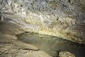 Ghliana karst cave is carved in limestone and has two entrances. The main entrance has height 3.5-4 meters, and width – 7 meters.[2] The main underground stream flows from this entrance. The second entrance to the left from the main entrance is very steep and measures 35-40 m from cave floor to the surface. 60 meters from entrance there is a deep siphon lake, 3-4 m wide, 2.5 m height above lake surface and 50 meters long. Behind the lake there is a 200 m long siphon corridor with it floor under water with depth of 0.5-2 meters. Behind the corridor there is a gallery with a length of 30 m and a width of 1-2 m. It traverses the bigger 150 m gallery with ceiling covered with stalactites almost it entire length. This gallery again has water and several siphonous exits to the bottom of the cave. The underground flow measures 50-55 litre per second in a flood. The water streams from the cave end up in Kumi river.[3]