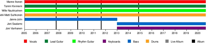 In 2013, long-time bassist Janne Julin left the band and was replaced Joni Saalamo. The band also acquired a new keyboardist in Joni Vanhanen. With this new lineup, the band recorded their fourth studio album, titled IV: One with the Storm. It was released on 7 November 2014, again via Season of Mist. The album was produced by the band and Tuomas Kokko.[3] In December of the following year, the band announced an indefinite hiatus in a Facebook post.[4]
