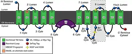 The structure of ghrelin O-acyltransferase has not been fully elucidated or tested experimentally. Using biochemical mapping tools, researchers showed that the ghrelin O-acyltransferase enzyme consists of eleven transmembrane helical domains and one reentrant loop.[7] The C-terminus of ghrelin O-acyltransferase is located on the cytosolic side of the endoplasmic reticulum (ER) while the N-terminus resides in the lumen of the membrane. The topology models of ghrelin O-acyltransferase are similar to those of acetyl-coenzyme A acetyltransferase 1 and glycerol uptake protein 1. This is consistent with ghrelin O-acyltransferase being a member of the membrane bound O-acyl transferase family.