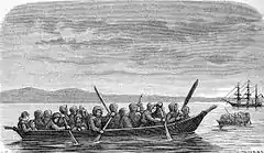 Chukchi boats by Olof Sörling, 1880, from Nordenskiöld's book of the expedition. The Vega in the background was equipped with sail as well as steam power.