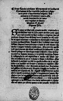 His Supplementum chronicarum (first printed at Venice, 1483)[3] was a supplement to the usual universal chronicle; it ran to numerous subsequent editions. Though it mixes mythological figures, treated euhemeristically as historical ones, on an equal footing with Christian cultural heroes, with additional chapters on the Sibyls and the Trojan War,[4] amongst other things, it was thought to contain Giovanni da Carignano's lost work on papal contacts at Avignon in 1306 with Ethiopian visitors.[5] Recent research has both drawn attention to the Legenda Aurea and the letter of Prester John as possible sources for Foresti's narration of the episode, casting doubt on the veracity of an Ethiopian embassy to Europe at this date,[6] as well as a section in the Cronica Universalis of Galvano Fiamma, indicating conversely that this section of Foresti's account is entirely and directly based, to exclusion of other sources, on the cartographic treatise of Giovanni da Carignano.[7]