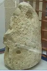 An intermediate stage of this process could be represented by the appearance of hammered relief sculptures during the Middle Bronze Age – in both Sardinia and Corsica: in the former country, baetyls were engraved with male or female gender characters in relief, while in the latter – perhaps due to the greater presence of metal implements – relief sculpture was applied for the first time to menhirs. In both islands, anthropomorphic statuary in the strict sense of the word would not exist between 1600 and 1250 BC, but gender characteristics and weapons were represented in Sardinia and Corsica respectively.[23] In a successive evolution stage, the relief technique was employed in Sardinia – for the first time after Eneolithic sculptures – to represent a human face, as shown in the famous baetyl of "San Pietro di Golgo" (Baunei).[25][26][27]