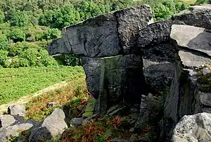 Hob Hurst's House is an unusual square Bronze Age burial cairn on Harland Edge (between Gibbet Moor and Beeley Moor). Thomas Bateman excavated the barrow in 1853 and discovered a stone cist containing cremated remains. It has been a protected national monument since 1882.[9]