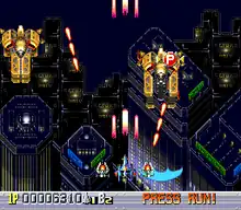 The PC Engine video game console, co-developed by NEC and Hudson Soft, was known for its quality graphical adventures and shoot 'em ups.[2][4] The game was printed using the Arcade CD-ROM² format which requires the Arcade Card RAM expansion for enhanced graphics.[3] Although shoot 'em ups were prominent in the late 1980s, popular interest shifted to fighting games in the wake of Street Fighter II's release in the early 1990s. In order to compete with the Super NES and Mega Drive, NEC developed a RAM expansion for the PC Engine called the "Arcade Card". The extra 2.25 MB of memory was large and allowed for higher quality ports of fighting games. Despite the waning popularity of shoot 'em ups, Hudson commissioned CAProduction to develop one as what would become the final Arcade Card game.[2]
