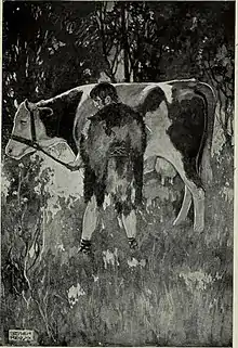 However, Jeremiah Curtin explains this differently: the form Glas Gainach which appears in one of his tales[16] contain a corruption of gaunach which is a cow with a yearling calf, which hasn't calved in the current year (a farrow cow). And the form Glas Gavlen in his Donegal version[17] references the cow-herder's term gavlen for a cow that has not calved in five years.[18]