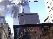 The Twin Towers burn behind an advertisement for the film.[34]