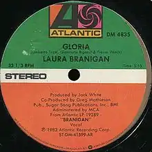 "Gloria" attained its highest profile via a re-working featured on the 1982 album Branigan, the first released album by Branigan. Although another selection, "All Night with Me", was chosen as the album's lead single, Branigan also performed the cover song during her promotional television appearances at the time of the album's release,[32] and the track was chosen as the album's second single in June 1982, first becoming a disco favorite, and gradually accruing radio support to enter the pop charts in July. The single reached number two on the Billboard Hot 100 on 27 November 1982, behind Lionel Richie's "Truly", and remained there the following two weeks, through 11 December—when Richie had been supplanted by Toni Basil's "Mickey".[33]