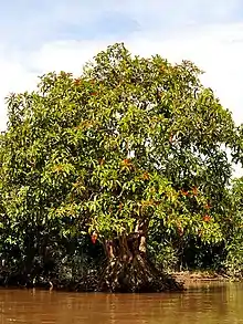 Gluta velutina grows as a shrub or tree up to 7 metres (20 ft) tall, with stilt-roots. Its smooth bark is brownish. The leaves measure up to 19 cm (7 in) long. The flowers are white. Its roundish, pale brown fruits measure up to 7.5 cm (3 in) in diameter.[2] The wood can cause dermatitis and the fruit and leaves are poisonous.[3]