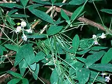 There are twenty-six perennial species found of Glycine. The length of the leaflet stalks identifies it, since it has a lengthy stalk.[2] The pea-shaped flower varies in color from purple to mauve which blossoms throughout Spring to Autumn seasons.[2] Once mature, their pods become black in color, with the seeds [usually 4 – 8] inside are red to brown.[3] The stems are typically slender and can reach to 1m in length, either trailing or creeping and often twining.[4][2] The stems are often covered in stiff, straight hairs, emerging from a thickened root system.[3] The leaves are usually tri-foliolate pinnate, and the rachis may vary in length between 5 and 45 mm, with pubescence comparable to the stem.[3]