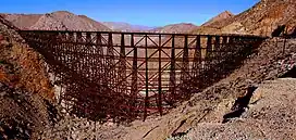 Goat Canyon Trestle is a wooden trestle in San Diego County, California.[1] At a length of 597–750 feet (182–229 m), it is the world's largest all-wood trestle.[1][8][10][11] Goat Canyon Trestle was built in 1933 as part of the San Diego and Arizona Eastern Railway, after one of the many tunnels through the Carrizo Gorge collapsed.[6][7] The railway had been called the "impossible railroad" upon its 1919 completion.[12] It ran through Baja California and eastern San Diego County before ending in Imperial Valley.[12] The trestle was made of wood, rather than metal, due to temperature fluctuations in the Carrizo Gorge.[6] By 2008, most rail traffic stopped using the trestle.[13]