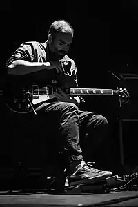 Although various members of the band are often pinned down as anarchists, no one in the band explicitly subscribed to this label;[18] however, as of 2014, Menuck was calling himself an anarchist.[19] In any case, there is a strong political component to the band's music.[20] Much of the band's music exudes left-wing and progressive themes. For example, the liner notes to Yanqui U.X.O. describe the song "09-15-00" as "Ariel Sharon surrounded by 1,000 Israeli soldiers marching on al-Haram Ash-Sharif & provoking another Intifada,"[21] the back cover of that album depicts the relationships of several major record labels to the military–industrial complex. During the at State's End! tour, Menuck showed his support for trans people, writing on his amplifier "transphobes eat shit and die alone".[22][23] Several of its songs also incorporate voice samples which express political sentiments, most notably "The Dead Flag Blues" (on F♯ A♯ ∞) and "BBF3" (on Slow Riot for New Zerø Kanada).
