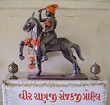 Traditions say that Mohadasa's grandson, Sejakji (1194–1254 CE or 1240–1290 CE), migrated to Saurashtra about VS 1250 and entered in service of Chudasama king Mahipala ruling from Junagadh. He obtained 12 villages around Sapur and from his progeny descended the Gohils of Saurashtra and other regions.[2][4] According to Bardic accounts, he entered in service of another Chudasama king Kavat and had his daughter Valamkunvarba married to Khengar, son of Kavat. Kavat gave him a grant of Shahpur and surrounding twelve villages in Panchal (central Sairashtra). Sejakji's sons Shahji and Saranji obtained Mandvi Chovisi and Arthila Chovisi due to interests of their sister Valamkunvarba. The rulers of Palitana State and Lathi State traces their ancestry to these two brothers.[1] James W. Watson, in Gazetteer of the Bombay Presidency: Kathiawar Volume VIII (1884) had given VS 1290 and reason as their rivalry with Rathods.[13] Sejakji is reported to have established new village named Sejakpur and won several villages surrounding it.[2][1]