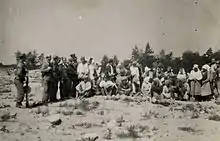 Photo printed in a 2008 article, "Gorączka złota w Treblince" ("Gold Rush in Treblinka") by Gazeta Wyborcza journalists Marcin Kowalski and Piotr Głuchowski. The photo served as an inspiration for Gross' Golden Harvest and was reprinted on his book's cover. However, according to research by Paweł Majewski and Michał Reszka and others, the photo actually shows local citizens sent in to clean up the grounds.[1]
