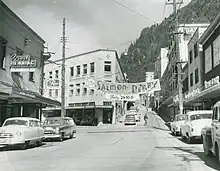 This view of Franklin Street in 1955 shows a banner for the Golden North Salmon Derby hanging above the intersection of Franklin and Front Streets. The Triangle Building is directly behind the banner.