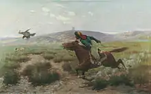Russian depiction of Mongolian falconers fox-hunting with a golden eagle.