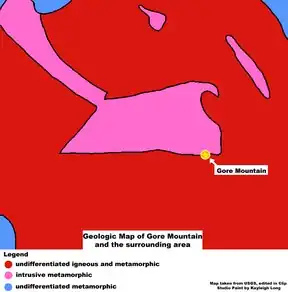 The Gore Mountain Garnet outcrop is located in the south central Adirondack mountains in northern New York.[1][3] The mountains themselves, which are part of the Canadian Grenville Province, are composed of three main parts, the first of which is a dome of anorthosite.[2][3] This dome underlies a mantle of syenite gneiss, which in turn underlies a metasedimentary sequence of marble, quartzite, amphibolite, and other types of gneiss.[3] The rock formation that Gore Mountain is famous for, the garnet amphibolite, is located 2600 ft up its northern slope.[4] Said rock outcrop measures about 50 m by 600 m and trends east-west, grading into garnet-bearing meta-gabbro to the east.[1][5] To the south of the garnet amphibolite is a fault that runs parallel to the contact line of a meta-syenite formation.[5] The garnet amphibolite also borders the southern margin of an olivine meta-gabbro formation.[5]