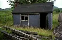 Platemen's bothy on east side of line at north end of platform, 26 August 1996. The dip in the skyline to the left of the bothy is the drovers' route to Glen Lyon.[17]