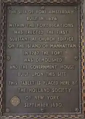 On September 29, 1890, the Holland Society of New York installed a commemorative tablet at 4 Bowling Green. It described that the Government House was built on the site of Fort Amsterdam, built in 1626.[28]