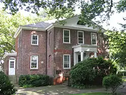 The Governor's House is a two-story Georgian brick structure. The footprint is similar to a Greek Cross, and the gable roof projections, covered with asphalt, intersect at the center of the "cross". The entrance portico contains Ionic columns under an entablature, with a paneled wooden door behind a transom, and is accessed by a concrete-upon-brick stoop.[3] At the entrance portico above the second story is a small lunette window.[2] The windows around the house are six-over-six, double-hung, with brownstone windowsills. The east-side annex has a Colonial Revival doorway and cast stone sills.[3]