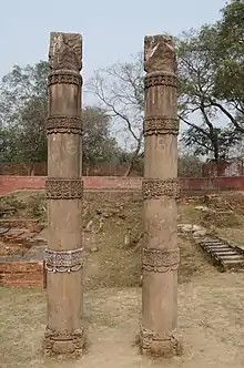 Remains of decorated pillars in the Dharmachakra-Jina-Vihara established by Queen Kumaradevi.