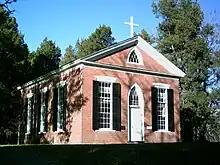 All elevations are fitted with windows; these are triple-hung with 12/12 sash, and are hung with louvered shutters and 8-inch rectilinear moldings; the moldings have been topped by ramped lintels with 6-inch-square corner blocks. Sitting over the entryway is a lancet transom with intersecting tracery, a similar design to which may also be seen in the window in the tympanum. On the east side of the church, the first bay is a jib window which according to local lore was used for funerals. The roof is surrounded by a cove cornice which serves to define two pediments, one in either facade. The roof is covered by Buckingham County, Virginia Buckingham Slate. Later additions to the exterior include a pair of small chimneys and a small wooden cross, which latter is situated at the apex of the front pediment and was erected in the 1950s.[4]