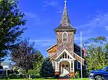 The Grace Church Complex, saw its 175th anniversary in 2019, is a historic Episcopal church complex in Massapequa, Nassau County, New York. The complex consists of the church, surrounding parish cemetery, the Floyd-Jones family cemetery, and the DeLancey Floyd-Jones Free Library. The small church was built in 1844 by Elbert Floyd-Jones and remodeled in 1905. It is a frame structure on a brick foundation and consists of a vestibule, nave, and chancel. It is in the Gothic Revival style and features a square bell tower with modest spire. The church also has Tiffany glass windows added during the remodeling.[2] Sometime after 1983, the old Grace Church was given to the Historical Society of the Massapequas.