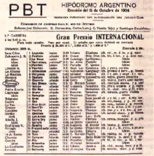 The Gran Premio Internacional Carlos Pellegrini was first run in 1887, under the name of the Gran Premio Internacional.[4] It was renamed the Gran Premio Carlos Pellegrini in 1941, with the name then changing between the two until 1979, when it was run as the Gran Premio República Argentina. Since 1980, the race has been run as the Gran Premio Carlos Pellegrini or Gran Premio Carlos Pellegrini Internacional. The location has also varied over time, being first run at the Hipódromo Nacional from 1887 to 1895, and then the Hipódromo Argentino from 1896 to 1940 and 1971 to 1978, and the Hipódromo de San Isidro from 1941 to 1970 and from 1979 to today.[6]