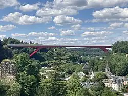 The Grand Duchess Charlotte Bridge (Luxembourgish: Groussherzogin-Charlotte-Bréck, French: Pont Grande-Duchesse Charlotte, German: Großherzogin-Charlotte-Brücke) is a road bridge in Luxembourg City, in southern Luxembourg. It carries the N51 across the Alzette, connecting Avenue John F. Kennedy, in Kirchberg, to Boulevard Robert Schuman, in Limpertsberg. The bridge is also known as the Red Bridge (Luxembourgish: Rout Bréck, German: Rote Brücke, French: Pont Rouge) on account of its distinctive red paintwork. It is the main route connecting the city centre, Ville Haute, to Kirchberg, the site of the city's European Union institutions.
