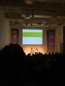 Grant Passmore and Hito Steyerl presenting their joint work at Rhizome Seven on Seven at the New Museum, May 2016.