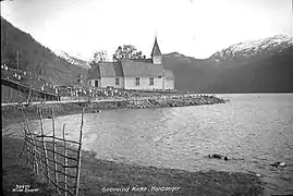 Granvin Church (Norwegian: Granvin kyrkje) is a parish church of the Church of Norway in Voss Municipality in Vestland county, Norway. It is located on the eastern shore of the Granvinsvatnet in the small farm area called "Granvin". This place located a few kilometers north of the village of Granvin. It is the church for the Granvin parish which is part of the Hardanger og Voss prosti (deanery) in the Diocese of Bjørgvin. The white, wooden church was built in a long church design in 1726 using plans drawn up by an unknown architect. The church seats about 350 people.[1][2]