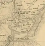 Navigation to the mouth of the Fox River was impeded by a series of sand bars jutting out from either side of Green Bay, and thus in 1837 funds were appropriated for the purpose of erecting a light in the area.[6][7] An initial recommendation to place such a light on Grassy Island (the most southerly of those bars) was countered by the observations of a Lt. Homans, who in visiting the area found the selected site "to be unsuitable for construction of buildings upon it of any durability, and totally uninhabitable by a keeper, being nearly under water, from the great rise of the lake, since the recommendation for a light upon it was made."[2] Instead, the Long Tail Point Light was erected further north.