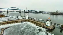 In 1998 the two towers were relocated to a breakwater at the edge of the yacht club property, and they were put through a lengthy restoration, being rededicated in 2005.[2][6] They were listed on the National Register of Historic Places that year.[5]