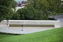 The design for the memorial included a small semicircular plaza, a low grey granite wall inscribed with quotations from Robert Kennedy's speeches (similar to the wall at the John F. Kennedy site), and a small reflecting pool.[31] The reflecting pool was designed to be only a few inches deep and about 4 feet (1.2 m) wide, and to extend the length of the wall. A straight granite pathway lead from the terrace at the John F. Kennedy grave to the semicircular plaza.[30] The original plan called for a grove of trees to be planted between the two Kennedy grave sites (to screen them from one another), another grove to be planted close by, and a large American Beech to be grown south of the plaza.[31]