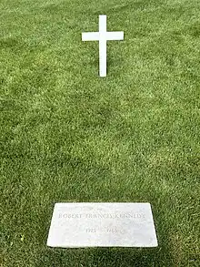 The grave is aligned along an east–west axis, roughly along the line of sight between Arlington House and the Jefferson Memorial.[1] The grave consists of an unadorned, white wooden cross at the head of the grave and a simple grey granite marker set flush with the earth at the foot of it.