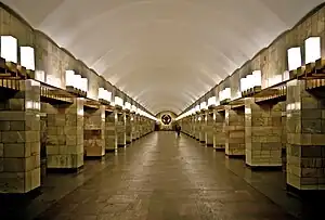 Grazhdansky Prospekt (Russian: Гражда́нский проспе́кт) (literally Civil Prospect)is a station on the Kirovsko-Vyborgskaya Line of the Saint Petersburg Metro. It was designed by architects A. Getskin, V Vydrin and E. Val' and opened on December 29, 1978. The station vestibule is located in the south-western corner of the intersection between Grazhdansky and Prosvesheniya avenues. It was built to serve the then-recent housing developments in the area. Since then, the neighborhoods in its proximity have continued to grow unabated, making it one of the metro's busier stations during rush hours.