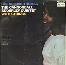 Great Love Themes is an album recorded in April 1966 by jazz saxophonist Julian Edwin "Cannonball" Adderley. It was released on the Capitol label featuring performances of ballads ― mostly Broadway show tunes ― by Cannonball Adderley with Nat Adderley, Joe Zawinul, Herbie Lewis, Roy McCurdy, and with string arrangements by Ray Ellis.[3][4] AllMusic awarded the album 1 star.[5] The album was produced by Tom Morgan, rather than Adderley's usual producer, David Axelrod. According to Adderley's biographer, Cary Ginell, "Although Cannonball loved to play show tunes, the lush, watered-down arrangements did not excited listeners, who had long since wearied of the jazz-artist-with-strings formula. Axelrod recalled that Cannonball hated the album and convinced Capitol to let him go back to working with Axelrod from then on."[6]