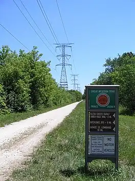 ![]() Eastern section of the Great Western Trail at Prince Crossing in West Chicago, at the western terminus, June 2006 | |