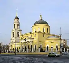 The church was commissioned by Prince Potemkin, the owner of a neighbouring messuage, shortly before his death.[1] The yellow-colored Neoclassical building was erected between 1798 and 1816. The name of the architect is not known for certain. It has been attributed either to Matvey Kazakov, who built numerous Moscow churches in the reign of Catherine the Great, or Ivan Starov, who frequently worked for Potemkin. The edifice was overhauled to Osip Bove's designs after the 1812 Fire of Moscow.[1] It stood unfinished for several decades and was not completed (under Afanasy Grigoriev's supervision) until 1848.