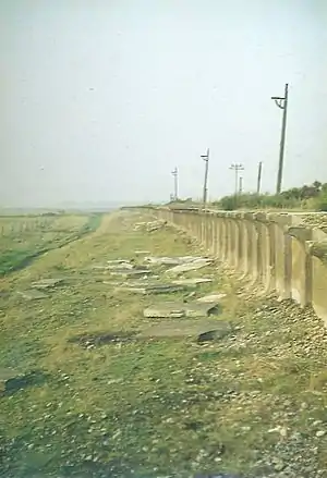 The station came about in 1937 when, in response to holiday camp development in the area, the Southern Railway decided to realign its branch line to New Romney (which had been opened in 1884) closer to the sea and to open two intermediate stations - Lydd-on-Sea and Greatstone-on-Sea. Greatstone was convenient for Greatstone Camp and Maddieson's Holiday Camp and competed with services provided by the Romney, Hythe and Dymchurch Railway (RHDR) which had already been operating in the area for a decade.[2] The station was equipped with basic facilities consisting of a long single platform on the up side with a simple shelter.[3] An extensive concrete forecourt was, however, provided for the coaches which were expected to ferry in crowds of holidaymakers.[4]