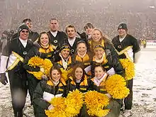The team took their name from Paul Hornung's nickname "The Golden Boy." They were founded in 1961 by national champion baton twirler Mary Jane Sorgel and they lasted until she got engaged in 1972.[2][7] The first squad consisted of sixteen students from Sorgel's dance studios around northeast Wisconsin doing routines designed by her.[3] "The girls I had on the field did more than just cheering," Sorgel said. "They did tumbling, I had some national baton twirling champions and dancers, and of course the pom girls. We were very colorful."[3] 1970 squad member Anne Maedke described their routine, "The Golden Girls did skits, dance routines – twirling and tumbling and acrobatic type things – in one-piece sequined swimsuits and high-heeled boots during breaks."[4] The Golden Girls cheered during the Ice Bowl.[7] The Golden Girls were honored by the team with a permanent installation at the Green Bay Packers Hall of Fame in May 2007.[4]