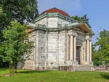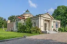 This structure, originally called the Mortuary Chapel,[31] was dedicated on November 11, 1902.[8] The chapel is in the Renaissance Revival style, and features a rotunda[32] capped in red vitrified tile.[33] The dome bears a resemblance to the Ohio Statehouse (then still under construction).[32] The structure rests on a bed of gravel 8 feet (2.4 m) below the surface. The foundations are of concrete and stone, and arches of brick and concrete support the building above. The exterior walls are of white marble, while the interior walls are clad in "English vein" Italian marble.[33][lower-alpha 8] The main entry doors are bronze and flanked by Ionic columns, while the interior floor is a geometric pattern of black and white tile. The dome, made of leaded art glass, supported by interior pilasters of bronze and marble.[33]