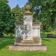 At the time, the cemetery was located 2.5 miles (4.0 km) west of the nascent village of Columbus.[9] The first burial at Green Lawn Cemetery was that of a child, Leonora Perry, on July 7, 1849.[11] The second, and first adult, was Dr. B. F. Gard on July 12.[18] The first headstone or other monument in the cemetery was erected the second week of October 1849 by William G. Deshler. It was for his wife, Olive, who had died at the age of 19. The monument consisted of an upright stone slab depicting a rose branch. The bloom itself was carved on the plinth on which the slab stood, and was inscribed "Olive, wife of William G. Deshler, age 19".[19] After Green Lawn opened, most of the families with graves at Franklinton Cemetery moved their ancestral remains to Green Lawn.[1][lower-alpha 5] Franklinton Cemetery quickly fell out of favor as a place to be buried.[8] Those buried at North Graveyard also disinterred loved ones' remains and moved them to Green Lawn. By 1869, about half of those buried at North Graveyard had been reinterred at Green Lawn.[19]