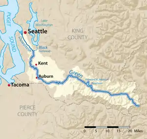 The Green River is a 65-mile (105 km) long river in the state of Washington in the United States, arising on the western slopes of the Cascade Range south of Interstate 90.