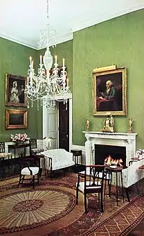 In 1961, First Lady Jacqueline Kennedy began a major refurbishment of the White House that included the Green Room. Her renovation was technically overseen by an advisory Committee on Fine Arts made up of museum professionals as well as wealthy individuals interested in antiques.[8] American antiques autodidact Henry Francis du Pont (an expert in Federal furniture) led this committee.[9] Mrs. Kennedy also brought in French interior designer Stéphane Boudin (an advocate of French interior design) and his company, Maison Jansen, to oversee the refurbishment.[10] Although du Pont and Boudin often competed with one another for control of redecoration of a space in the White House, the Green Room represents an area where they cooperated more closely.[4] This was because the Green Room had a long history as a Federal-style room, an area in which du Pont and his committee were experts.[6] The Green Room was the first room in the White House to be redesigned almost completely with the input of the committee.[4][lower-alpha 1]