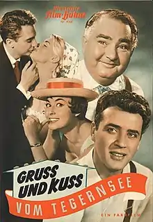 Greetings and Kisses from Tegernsee (German: Gruß und Kuß vom Tegernsee) is a 1957 West German musical romantic comedy film directed by Rudolf Schündler and starring Elma Karlowa, Bert Fortell and Christiane Maybach. It was part of a large number of heimatfilm produced during the decade.[1][2] It was shot at the Bavaria Studios in Munich and on location around Tegernsee. The film's sets were designed by the art directors Willi Herrmann and Heinrich Weidemann.
