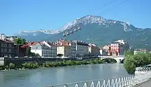 In the foreground is the Isère river, and behind that the Drac river. The straight avenue is the 8 km-long Cours Jean Jaurès, which finishes at the Place Hubert Dubedout. In the background are the Vercors mountains, and in front of the Isère the Chartreuse mountains (to which the Bastille belongs).