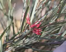 Grevillea extorris is an erect shrub that typically grows to a height of 1–2.5 m (3 ft 3 in – 8 ft 2 in). Its leaves are linear to narrowly oblong, 40–120 mm (1.6–4.7 in) long and 1–3 mm (0.039–0.118 in) wide. The edges of the leaves are turned down or rolled under, the upper surface of the leaves silky-hairy at first, later glabrous, the lower surface silky-hairy or obscured. The flowers are arranged on the stems or in leaf axils in clusters of three to twelve flowers on a rachis 0.5–4 mm (0.020–0.157 in) long. The flowers are pink to red or yellow, the pistil 28–38 mm (1.1–1.5 in) long. Flowering occurs from April to September and the fruit is an oval follicle 11–15 mm (0.43–0.59 in) long.[3][4]